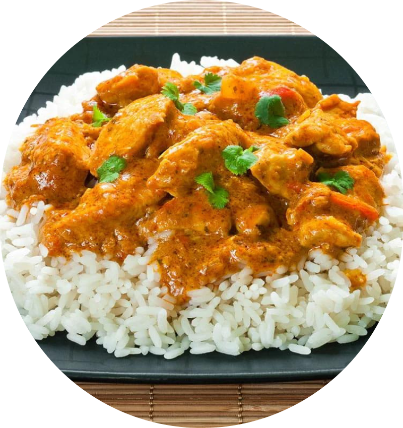 Peito de frango, especiarias de caril, leite de coco, arroz basmati.